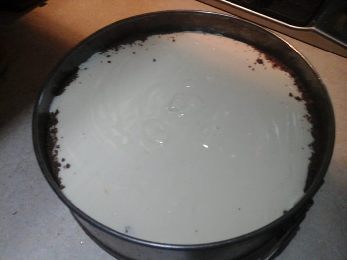 Духовку разогреваем до 200°С. Ставим в духовку пирог и выпекаем 11 — 12 минут. Убавляем жар до 105 — 110°С и оставляем на час-полтора. Проверяем десерт: если середина жидкая, а бока упругие, духовку можно выключать. Оставляем чизкейк в духовке до полного остывания, а затем, закрыв пленкой, помещаем в холодильник на 6 — 12 часов. Чем дольше, тем лучше.