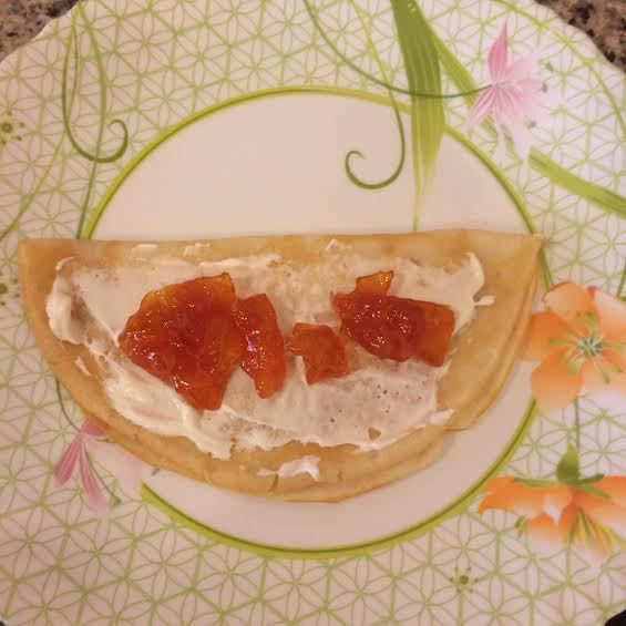 Готовый креп сложить, смазать слегка сметаной и джемом.