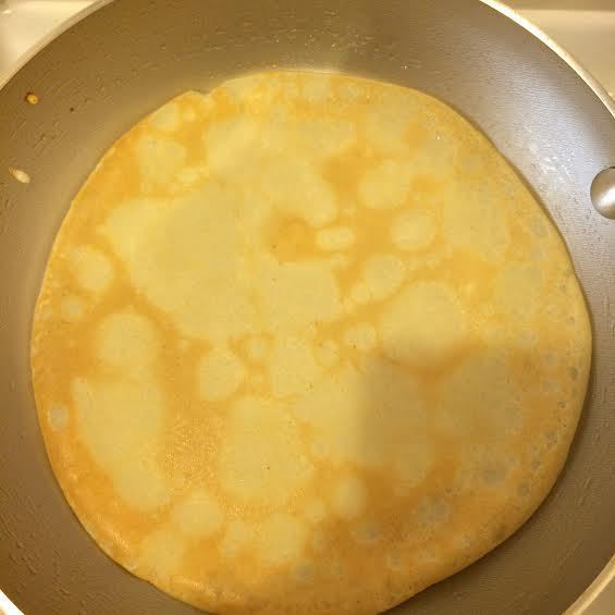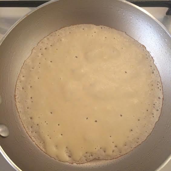 Сковороду (диаметр — 20) нагреть, смазать раститетьным маслом и начать выпекать крепы.