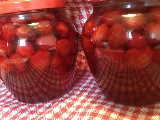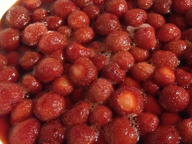 Затем сироп сливаем снова в кастрюльку, доводим до кипения (не кипятим) и варим на маленьком огне 5 — 7 минут. Снова горячим сиропом заливаем клубнику, накрываем, даем остыть. Так повторить 3 — 4 раза.