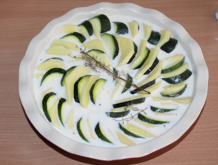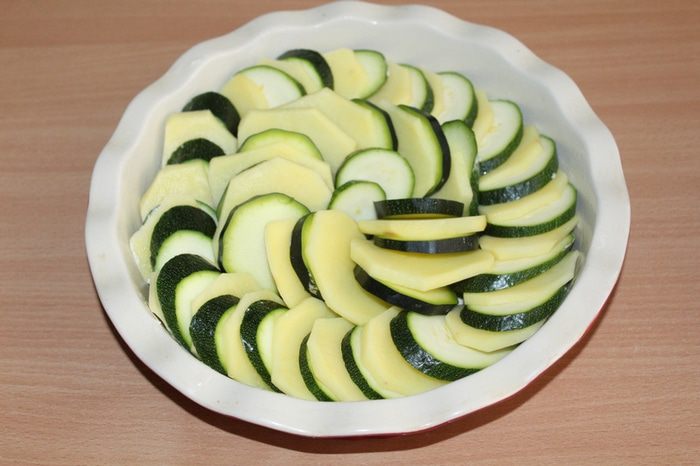 Форму для запекания d=25 см. смазать сливочным маслом, выложить туда овощи внахлест в один ряд.