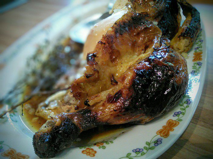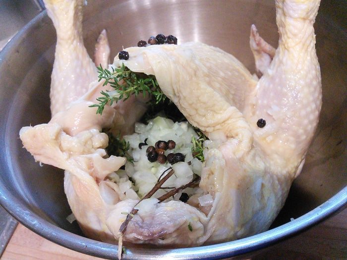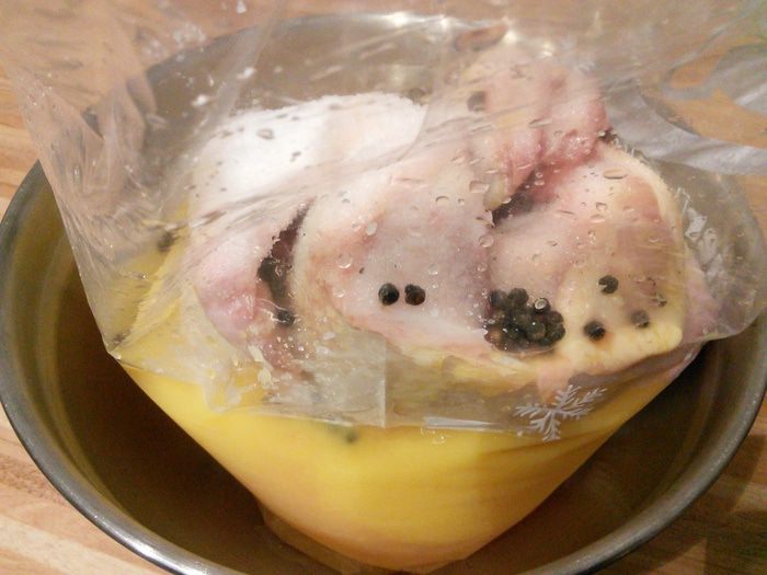 Курицу промыть, обсушить. Установить «насест»: в миску поместить плотный полиэтиленовый пакет, в пакет положить курицу, залить апельсиновым соком, добавить 3 — 4 ст. л. соли и горошины перца. Не бойтесь добавить столько соли, курица возьмет столько, сколько ей нужно.