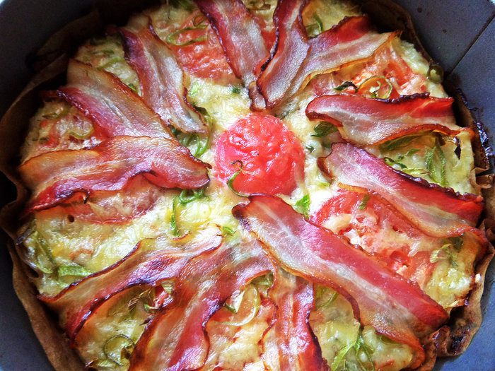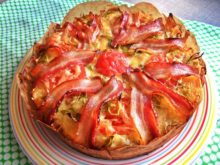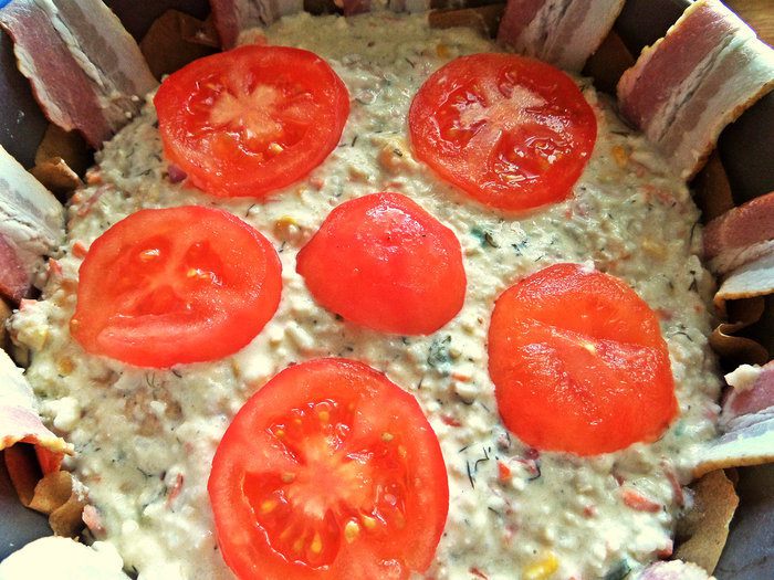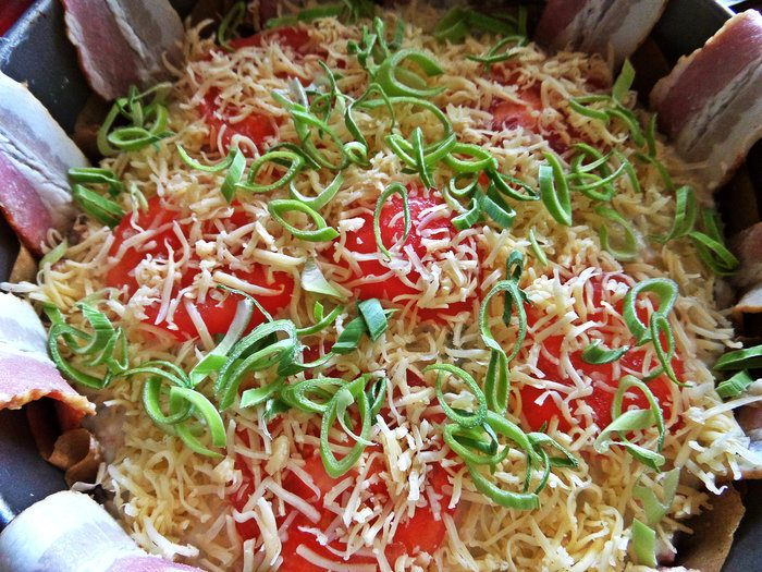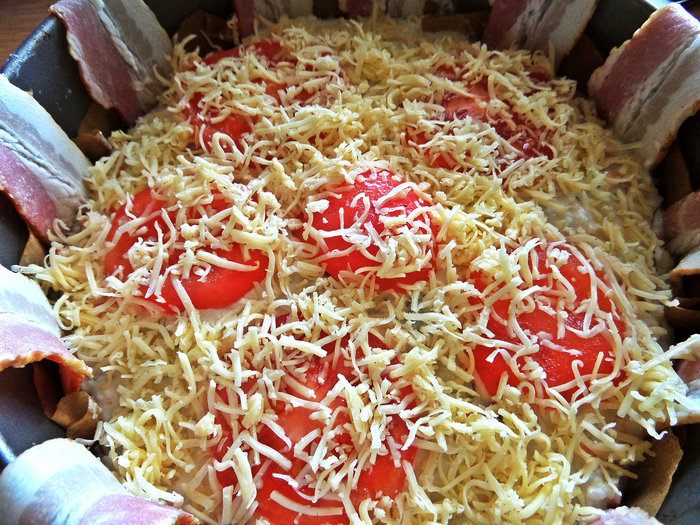 Съемную форму застелить пергаментом и разложить ломтики бекона на расстоянии.
