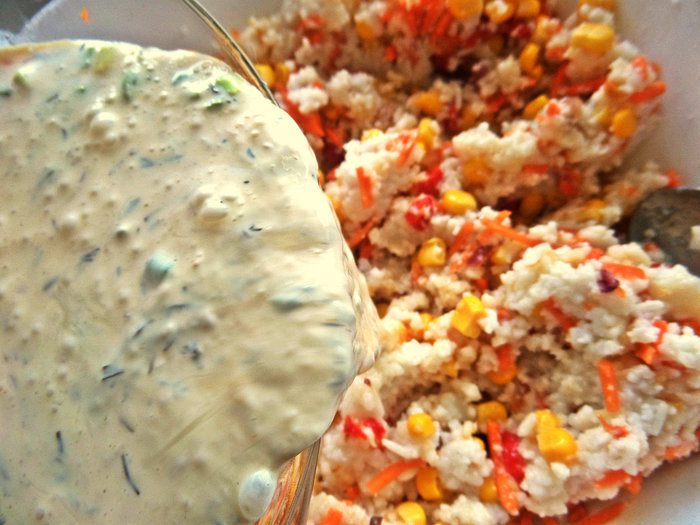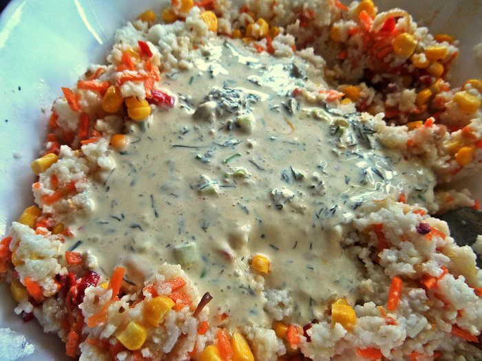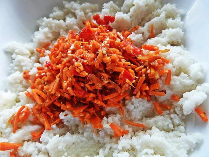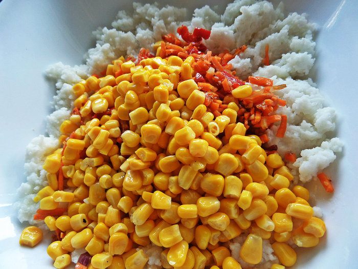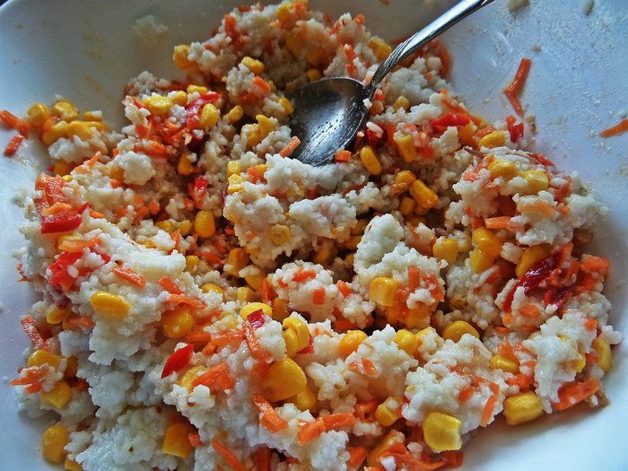 Морковь и сладкий перец порубить мелко и смешать с отваренным рисом.