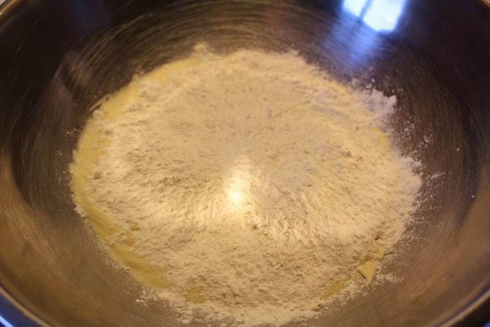Просеиваем муку с пекарским порошком и солью в 2 — 3 захода.