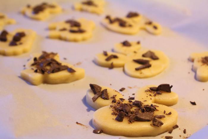 Разогреваем духовку на 180°С, выкладываем на противень, застеленный бумагой для выпечки, наши коржики.