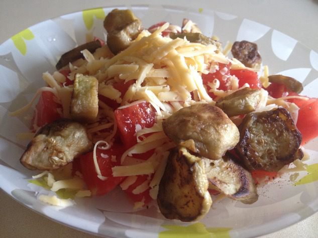 Баклажан очистить, нарезать кружочками, посыпать солью, дать постоять (минут 20 минимум). Слить воду, поджарить на растительном масле. Помидоры нарезать крупно, сыр потереть на крупной терке, выложить баклажаны.