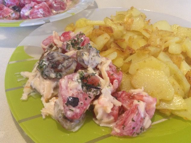 Этот салат хорошо подходит к жареному картофелю. У меня картофель с карри, розмарином и чесноком.