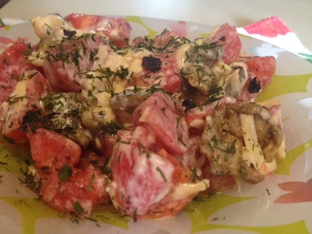 Смешать сметану, майонез, чеснок (выдавить или потереть на терке), перец молотый. Этим соусом заправить салат.