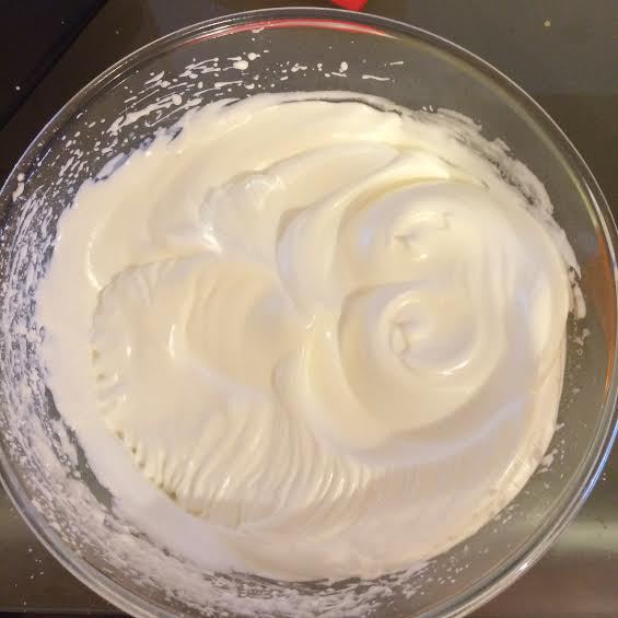 Белки взбить с сахарной пудрой до образования устойчивых пиков, в конце добавить крахмал.