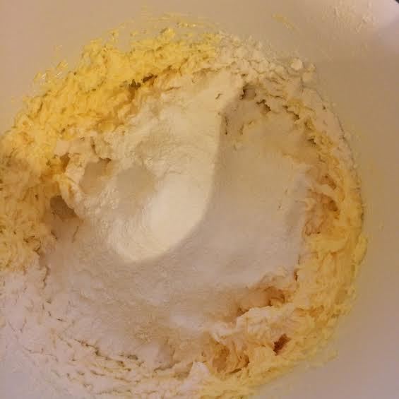 Масло взбить с сахаром и солью. Добавить желтки еще раз взбить. Муку просеять с разрыхлителем. Начать постепенно добавлять муку.