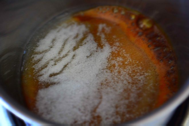 Для начала надо замочить желатин в 24 г холодной воды.отставить для набухания. Взять сотейник влить в него яблочный сок, если не добавляете виски,тогда сока надо 200 г, нагреть его до кипения. В другой сухой сотейник всыпать 50 г сахара и поставить на огонь, постепенно он начнет темнеть, главное не мешать, а только встряхивать сотейник. Когда весь сахар растворится и станет карамельного цвета, влить горячий сок и виски, перемешать. Добавить разбухший желатин, перемешать до растворения.