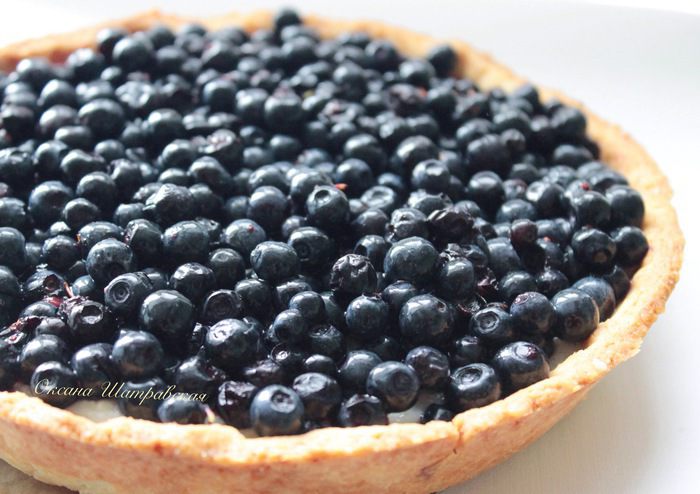 Теплый крем выложить на остывшую песочную основу, сверху посыпать черникой.