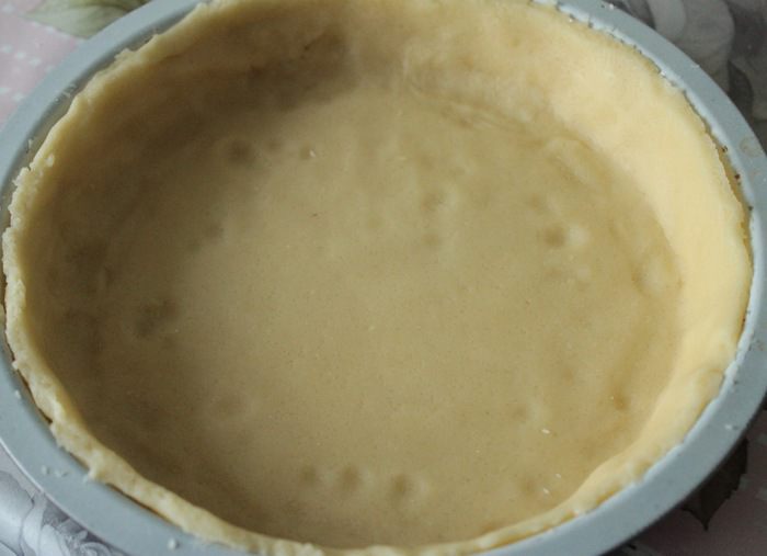 Охлажденное тесто раскатать в пласт, выложить в форму диаметром 20 см. Поставить форму с тестом в морозильник на 10 мин.