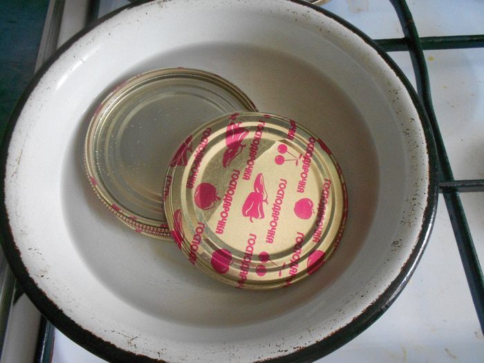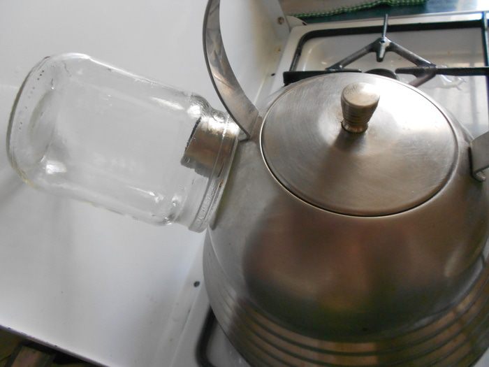 Полулитровые баночки или любые другие подходящие по размеру помыть пищевой содой. Проверьте, горлышко баночек должно быть без повреждений (сколов стекла). Чистые банки стерилизовать на кипящем чайнике, как показано на фотографии. Аккуратно снять банки прихваткой, так как они горячие!