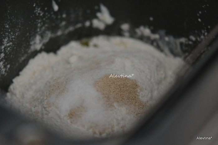 Закладываем в хлебопечку, как сказано в вашей инструкции. Сначала растопленное сливочное масло, теплое молоко, яйцо комнатной температуры, йогурт не сладкий. Затем сухие продукты: мука 2 1/2 стакана, сахар, соль и активные сухие дрожжи.