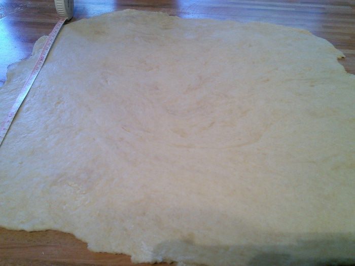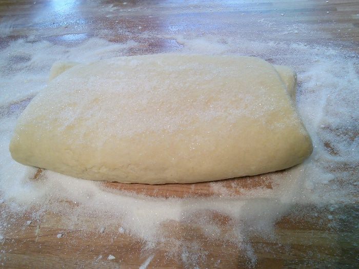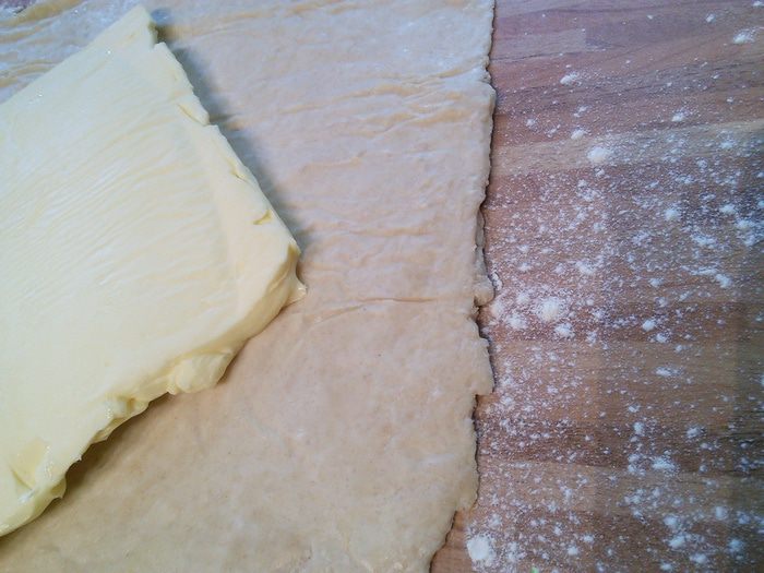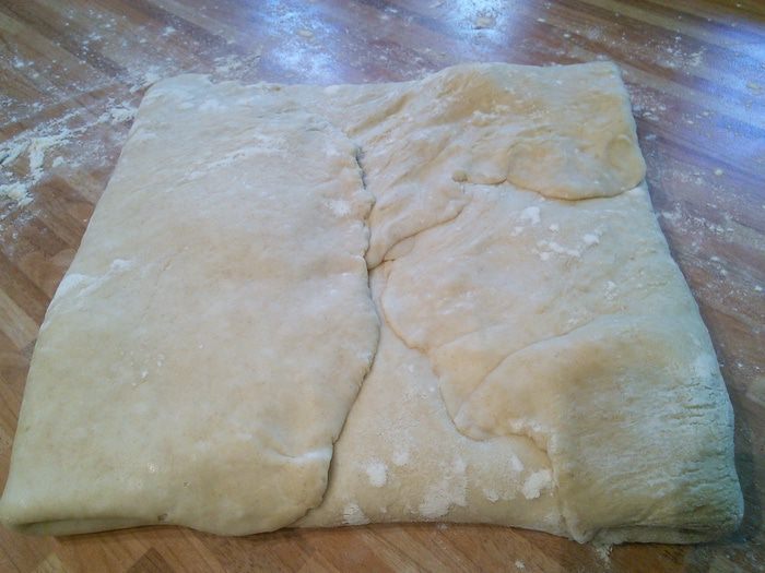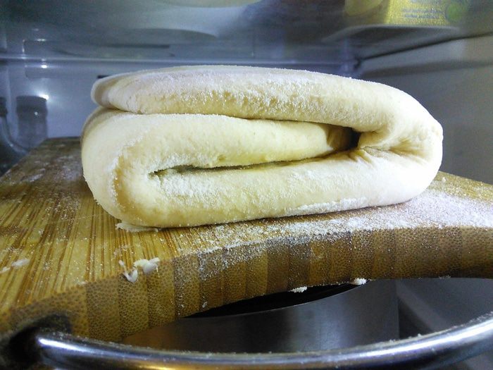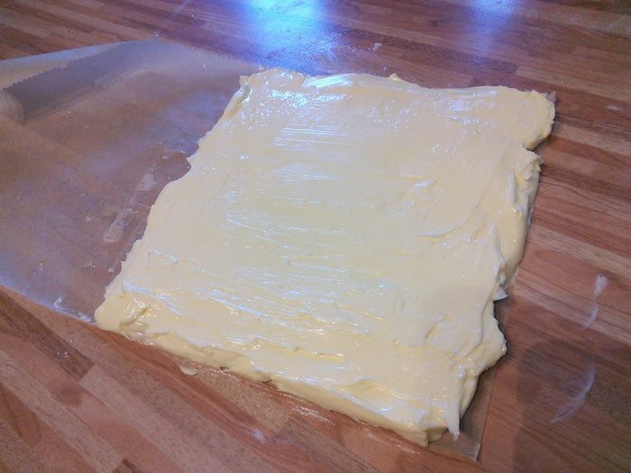 Тем временем разрезать лист пергаментной бумаги так, чтобы получить прямоугольник размером 20 x 40 cм. Сложить на половину. У нас получится квадрат размером 20 x 20 см. Бумагу раскрыть, положить внутрь масло комнатной температуры, распределить по одной стороне, накрыть другой. Масляную пластину положить также в холодильник.