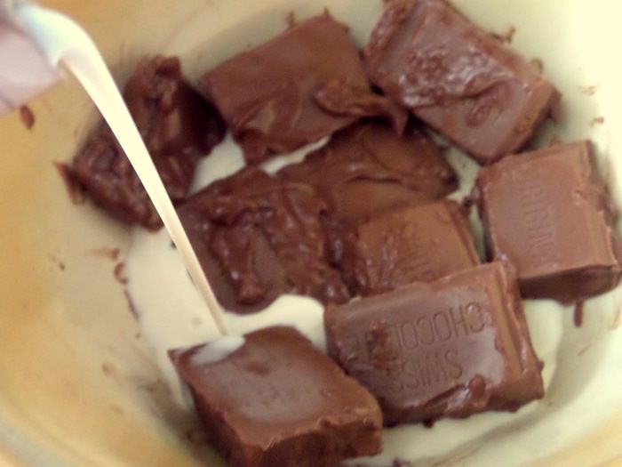 Шоколад поломать на кусочки и поставить на водяную баню, плеснув сливок.