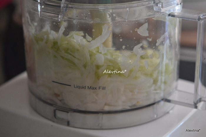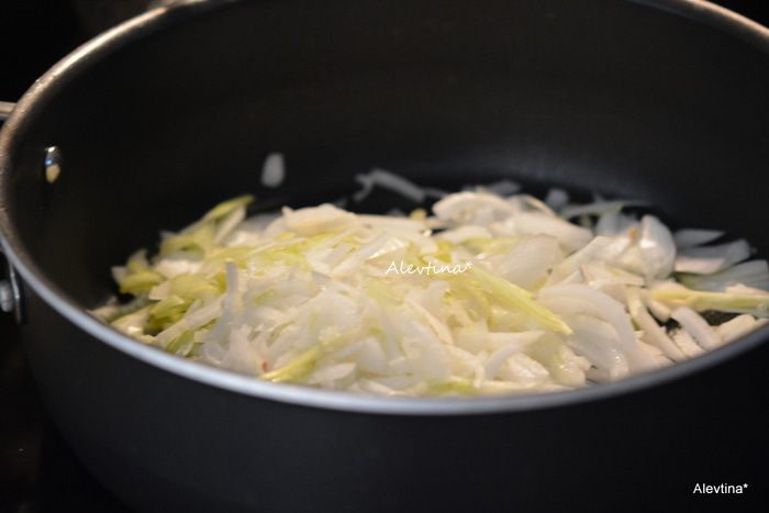 Лук (крупная головка) очистить и нарезать тонко, затем черешки сельдерея.