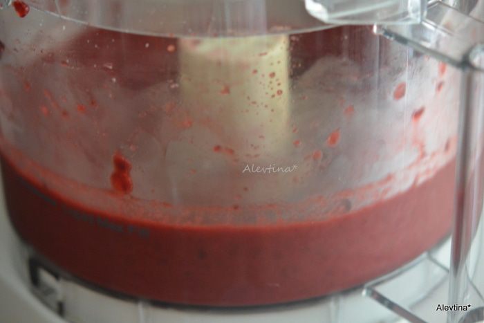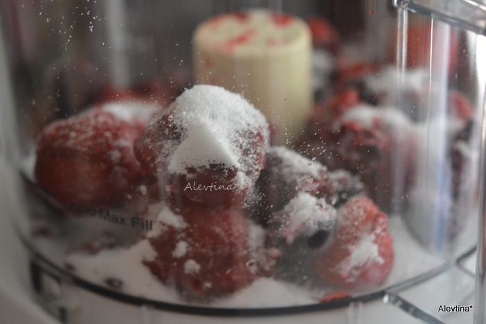 Ягоды очищенные выложить в чашу кухонного комбайна, насадка нож. Добавить 2 ст. л. сахара.