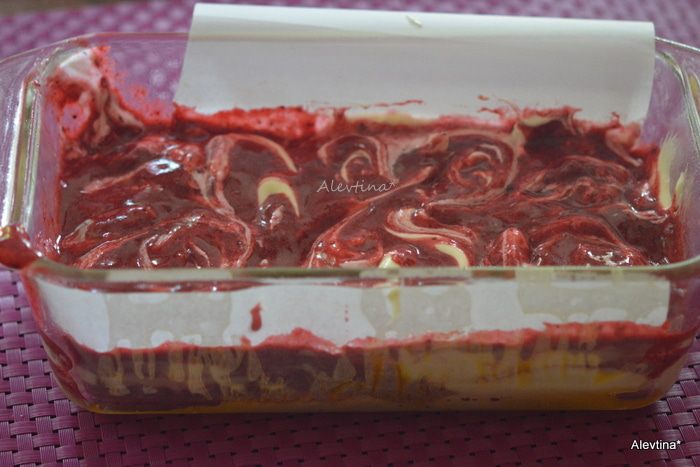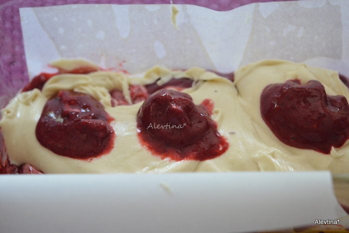 Выкладывать тесто партиями, затем ягодный соус, каждый раз ножом аккуратно прокручивая. Повторить слои тесто, ягодный соус.