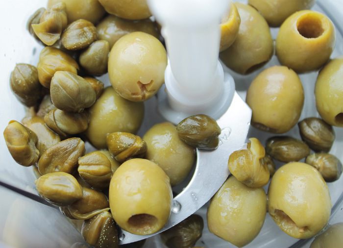Измельчить в процессоре оливки, каперсы в течение 30 секунд.