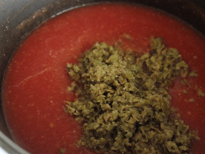 Помидоры остудить, очистить от кожуры и пюрировать блендером. Смешать томатное пюре и томатный сок, довести до кипения. Добавить соль, свежемолотый перец, пасту из оливок и каперсов.