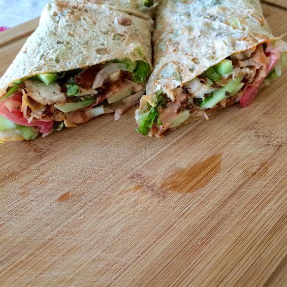 Выложить на лаваш: салат, лук, помидор, огурец и курицу. Полить остатками соуса и посыпать перцем.