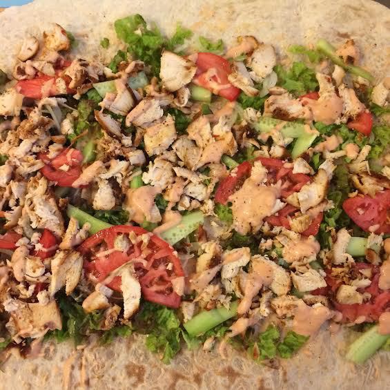В миске смешать кетчуп, майонез и орегано. Лаваш слегка смазать соусом. Овощи и куриное филе порезать не очень мелко.