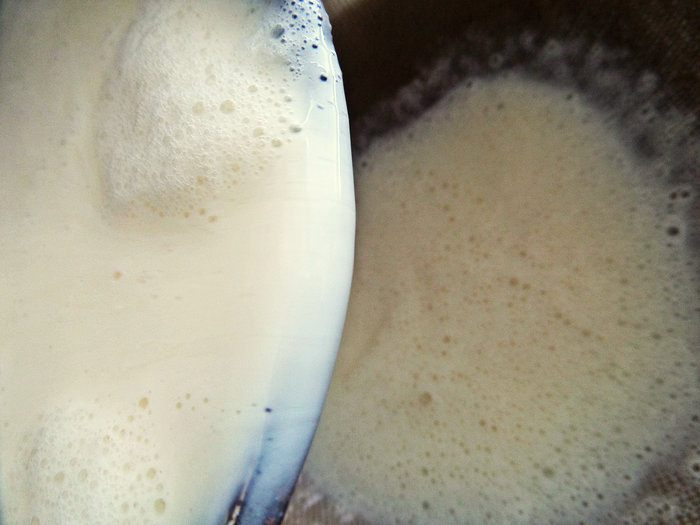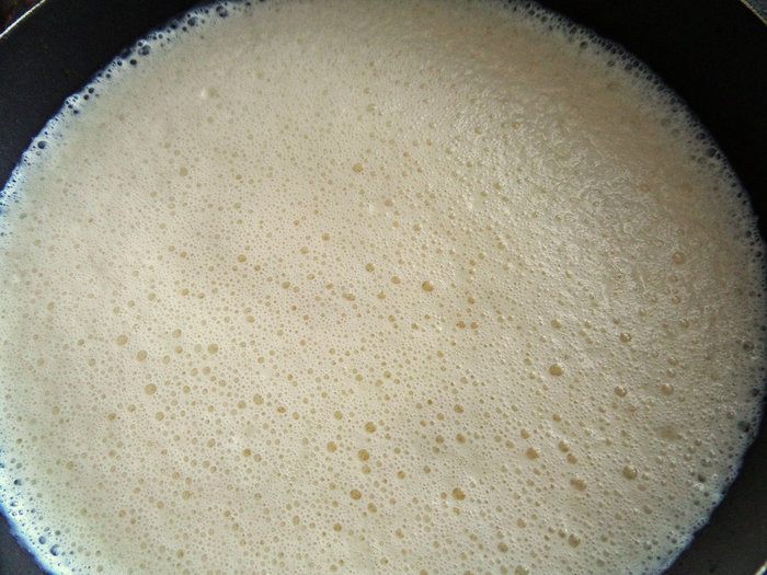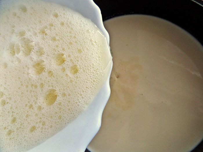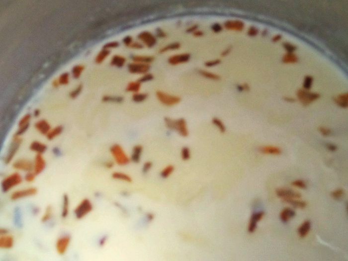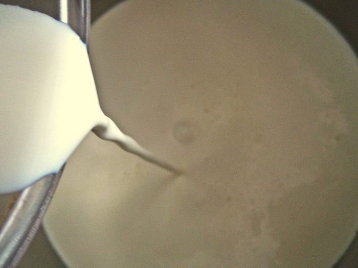 Сливки и молоко влить в кастрюлю с толстым дном и поставить нагреваться почти до кипения.
