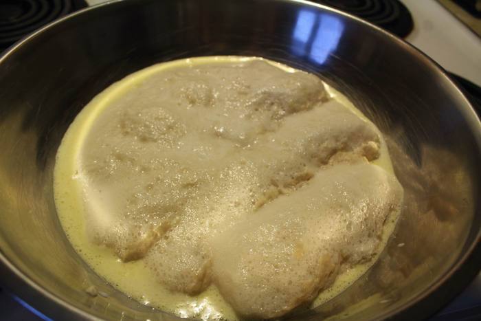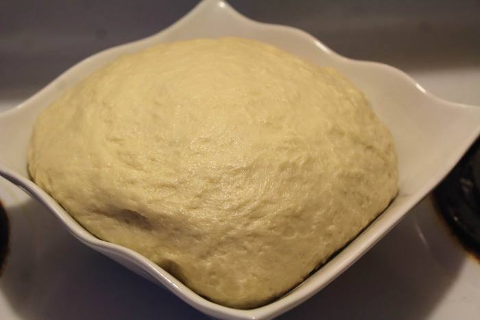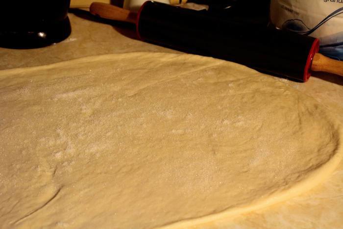 Разделяем на 2 половины, одну раскатываем где-то в 0,5 см толщиной, смазываем растительным маслом и посыпаем половиной оставшегося сахара. Булочки получаются малосладкими, потому тем, кто любит булочки сладкие — порцию сахара можно удвоить на даном этапе.