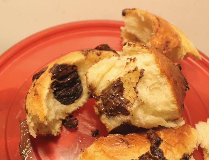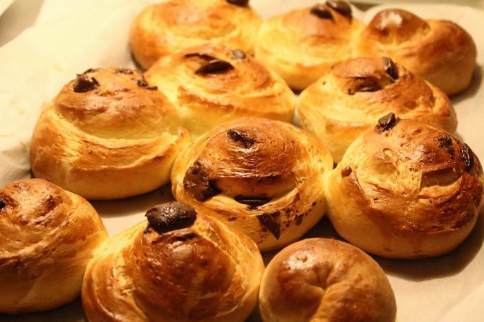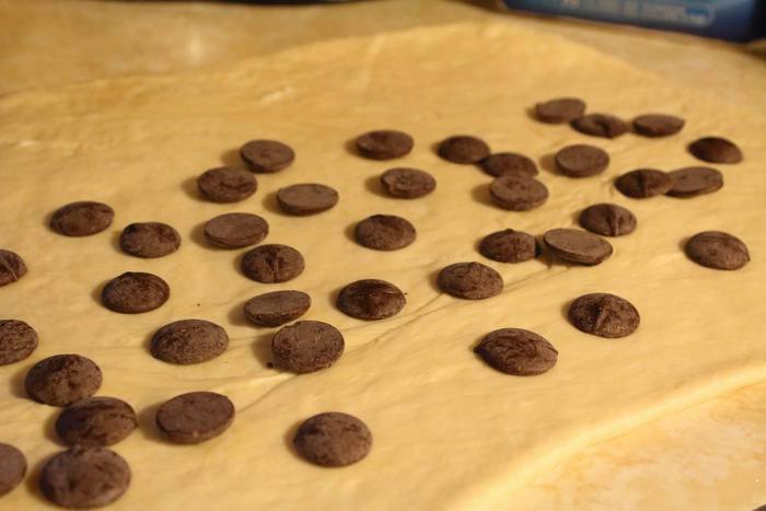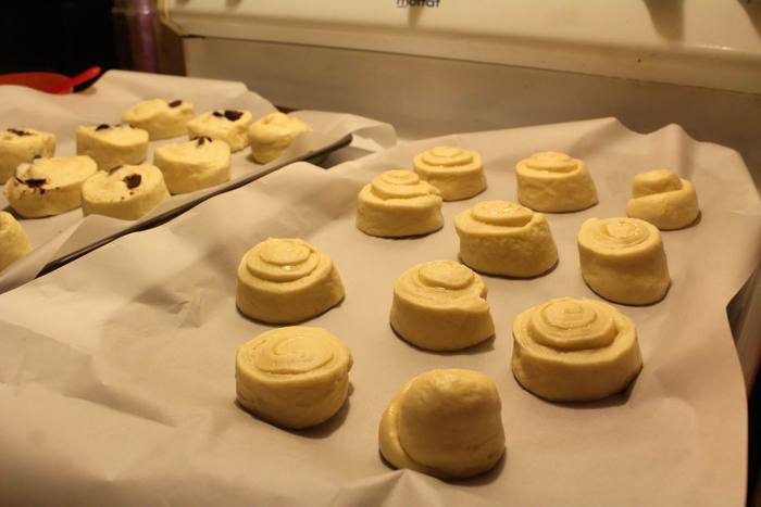 Скручиваем в рулет и режем на порции, толщиной 5-7 см. Выкладываем на противень, застеленый пекарской бумагой, и даем постоять еще минут 15 перед отправкой в духовку.
