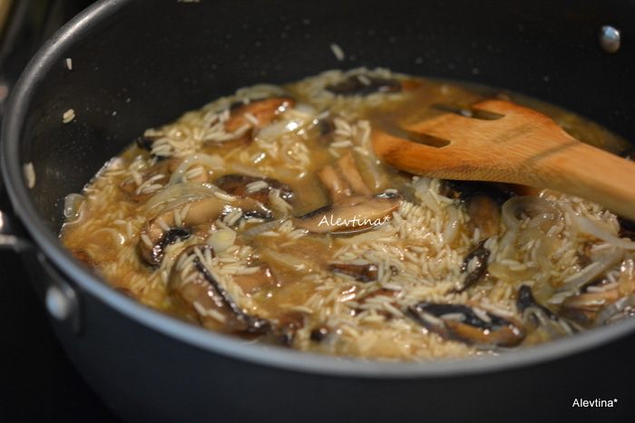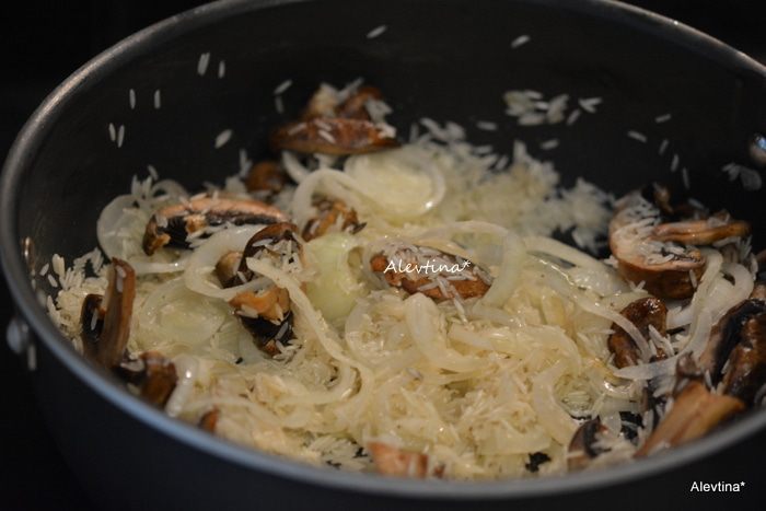 Добавим рис, готовим, помешивая 2 мин. Влить вино, перемешать. Затем разогретый бульон по 1/2 стакана через небольшие промежутки. Помешиваем каждый раз. Когда рис слегка смягчится, готовим блюдо 20-25 мин.