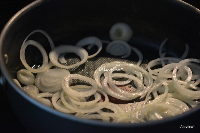 Растопить сливочное масло 2 ст.л на сковороде с оливковым маслом. Добавить тонко нарезанную луковицу. Готовить примерно 5 мин.