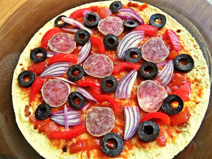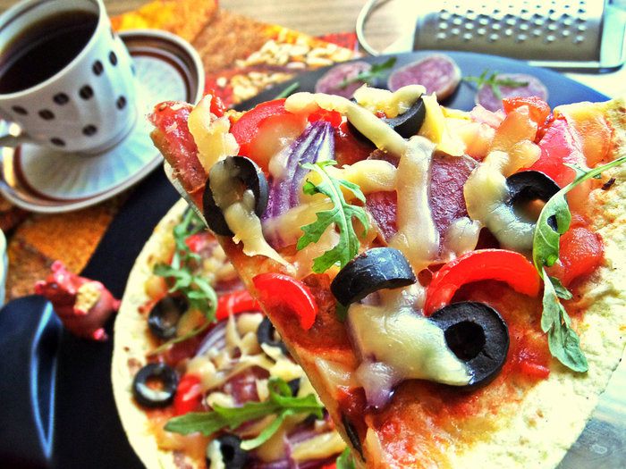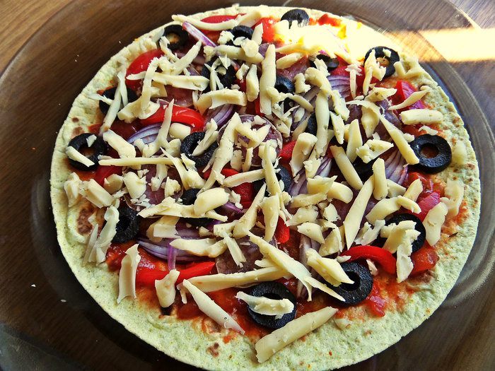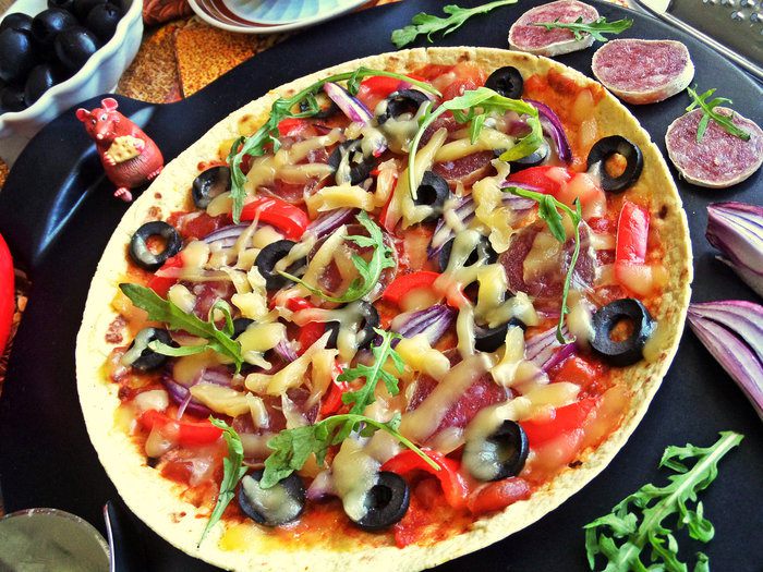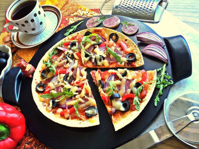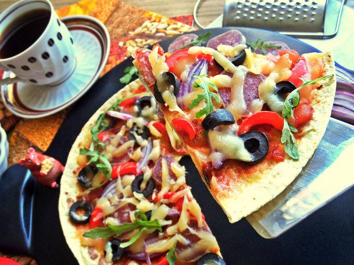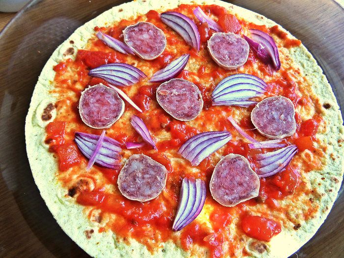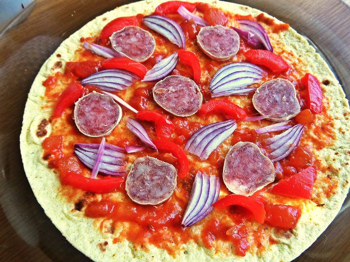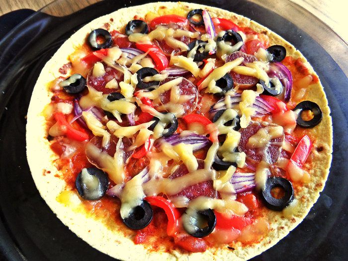 Если есть в запасе (в морозилке) лаваш или тортилья, даже в жару можно перекусить вкусной экспресс-пиццей! Если сложить пополам, можно взять такой перкус в дорогу.