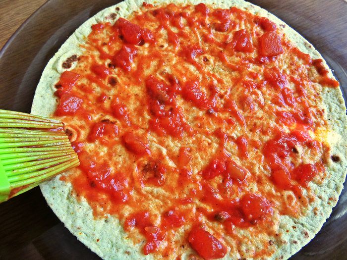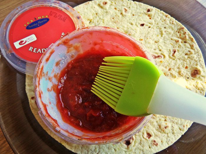 Кисточкой смазываем любым томатным соусом (у меня готовая сальса).