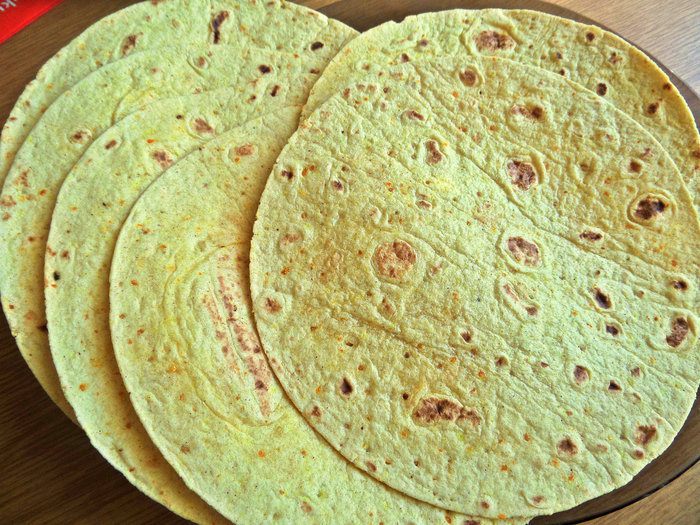 Нужна тортилья (у меня кукурузная) или лаваш, из которого вырезаем круг не шире диаметра тарелки.