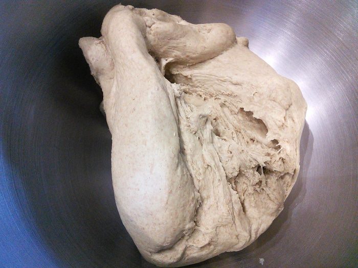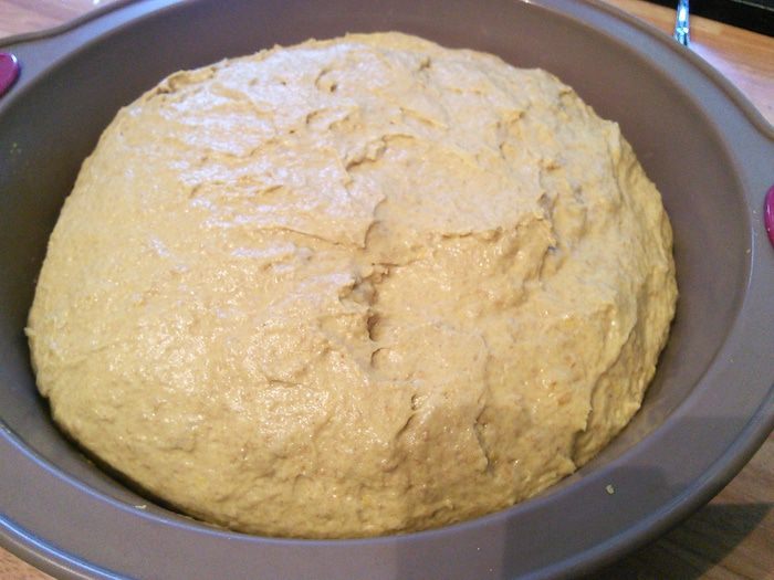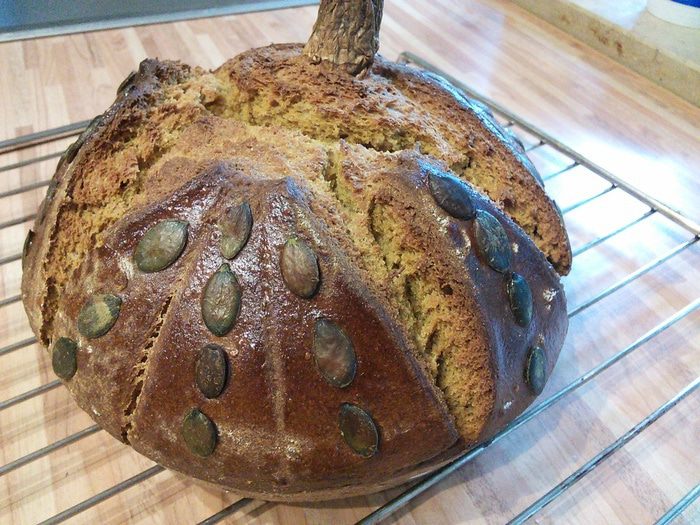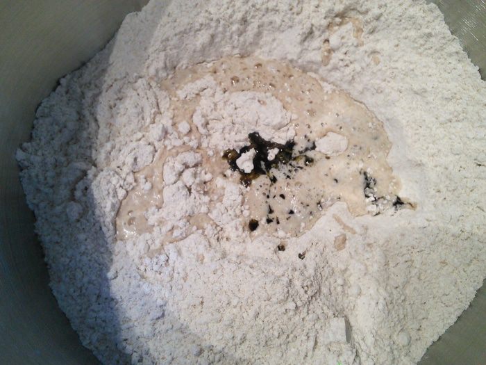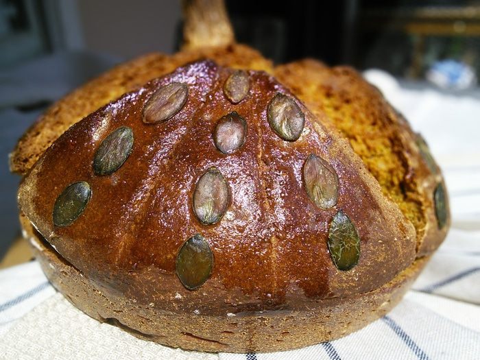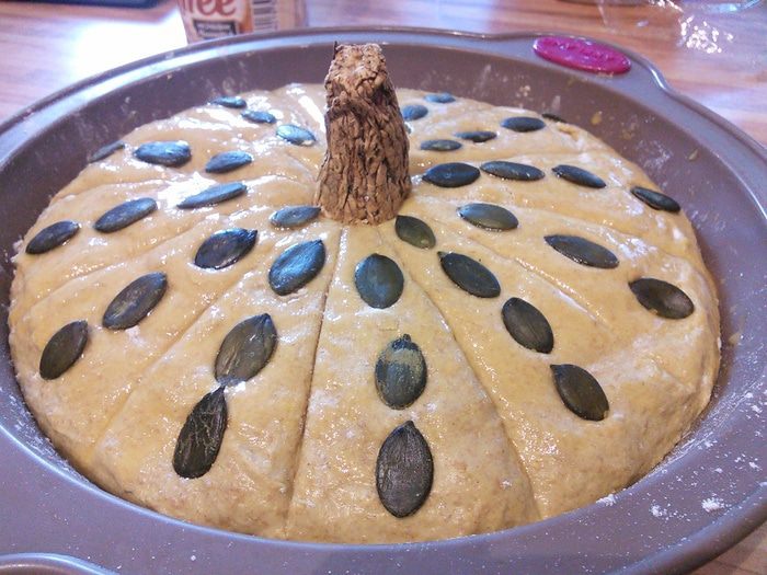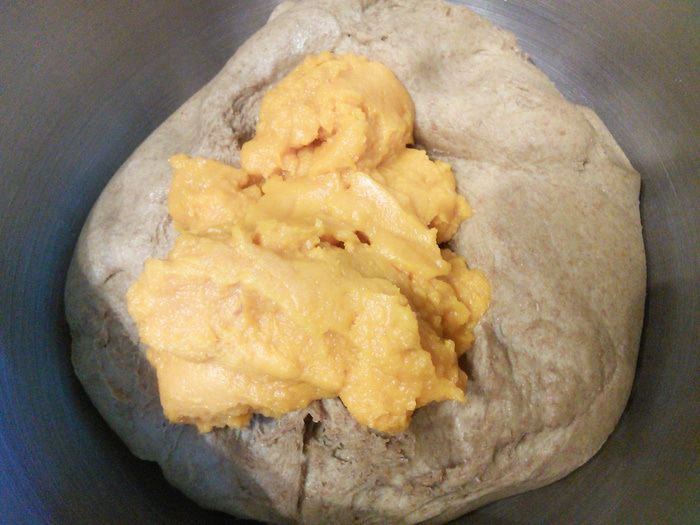 Дрожжи развести в теплой воде, оставить на 15 минут, для того, чтобы убедиться в их работоспособности. В чаше комбайна смешать оба вида муки, соль, добавить разбавленные дрожжи и тыквенное масло (если его нет, то оливковое) и замесить тесто в течении 10 мин.