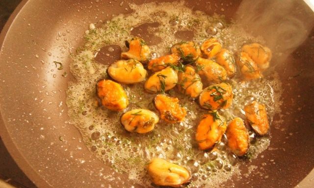 Мидии предварительно разморозить. Обжарить их на оливковом масле, присолить и добавить измельченный укроп.
