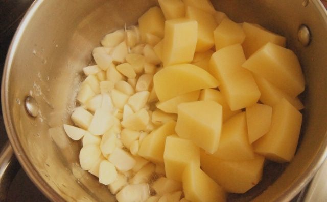 Почистить чеснок и картофель. Чеснок нарезать на 4 части, картофель — крупными кубиками. В кастрюльке разогреть оба вида масла, добавить чеснок и картофель. Тушить около 5 минут, помешивая.