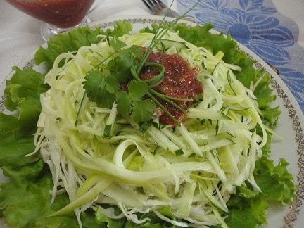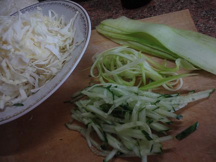 Кабачок, капусту и огурец нашинковать мелкой соломкой. Выложить на листья салата.