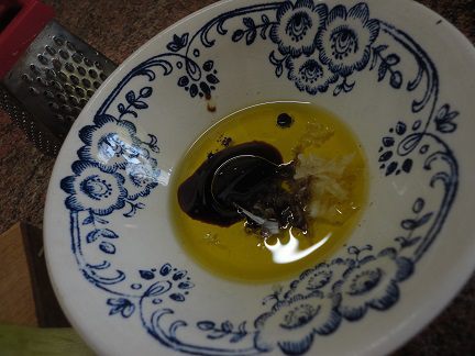 Для заливки смешать оливковое масло, бальзамический уксус и чеснок.