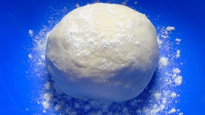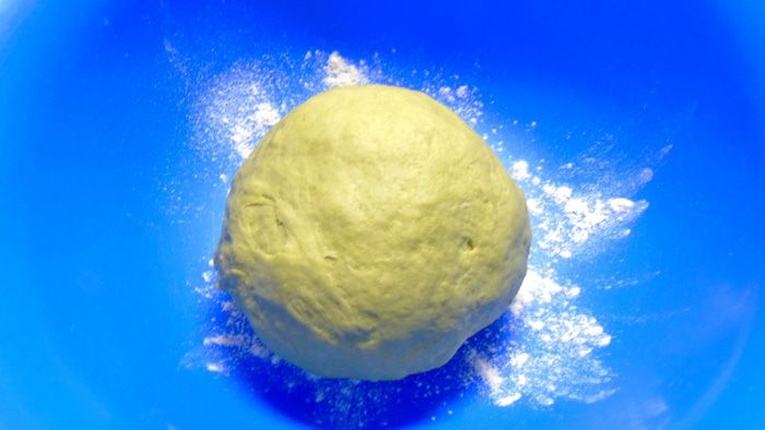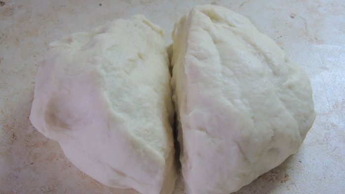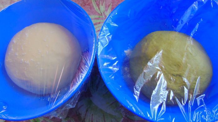 Одну часть кладем в припыленную мукой миску, накрываем (я пленкой) и оставляем на час подойти.