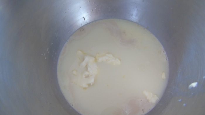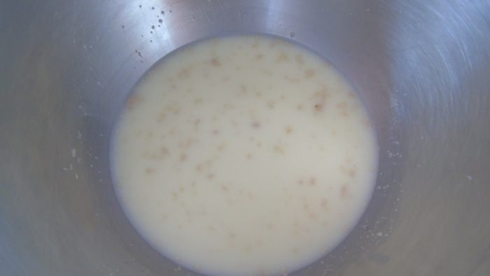 Развести дрожжи с сахаром в теплом молоке размешанном с водой.