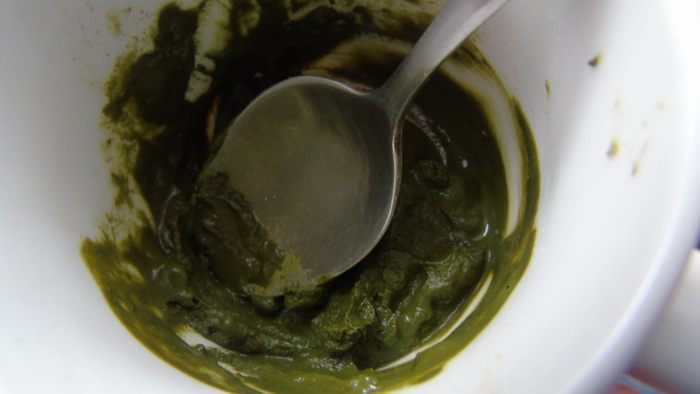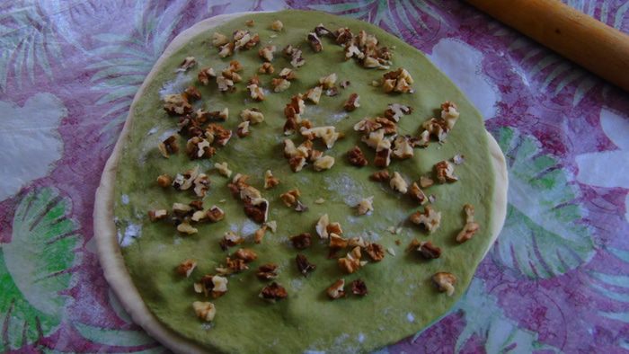 Раскатываем зеленое тесто и присыпаем оставшимися орехами.