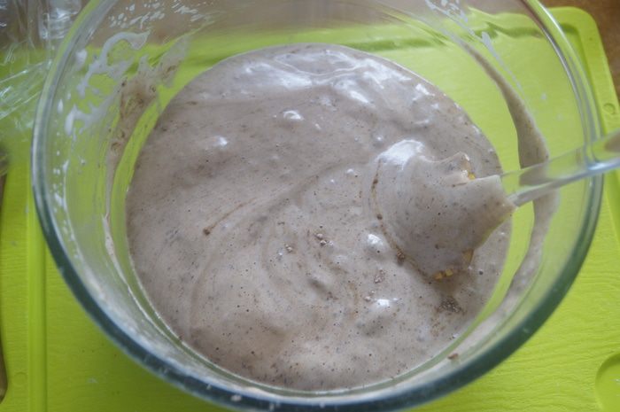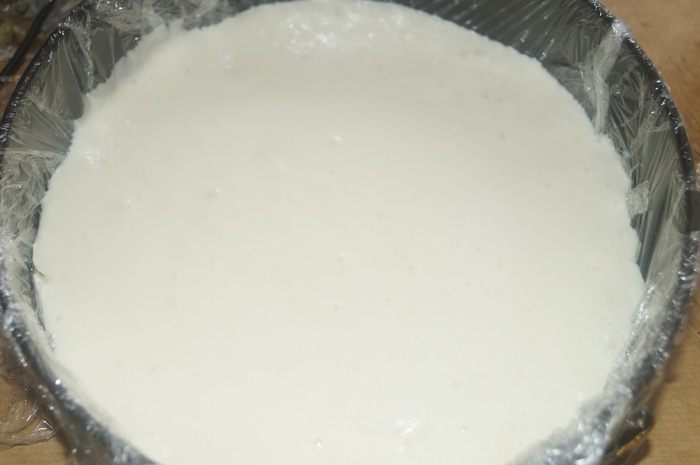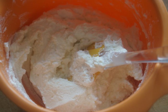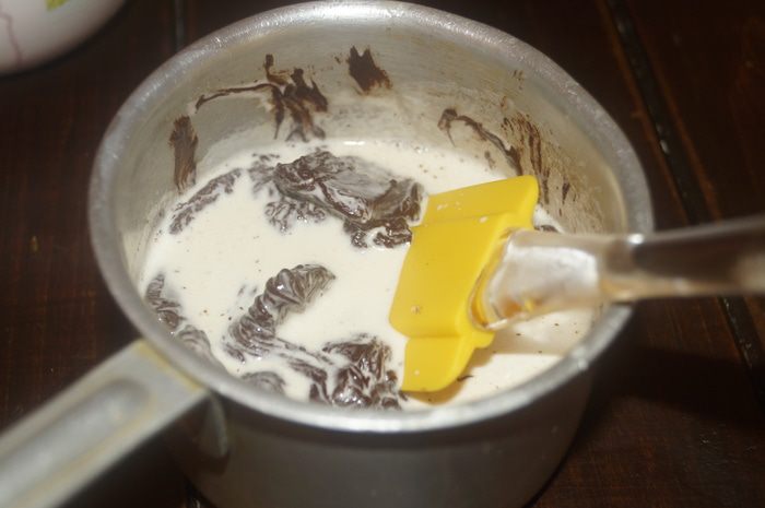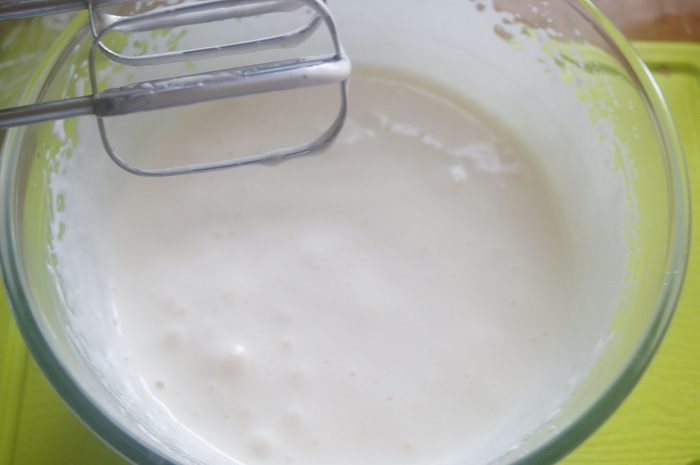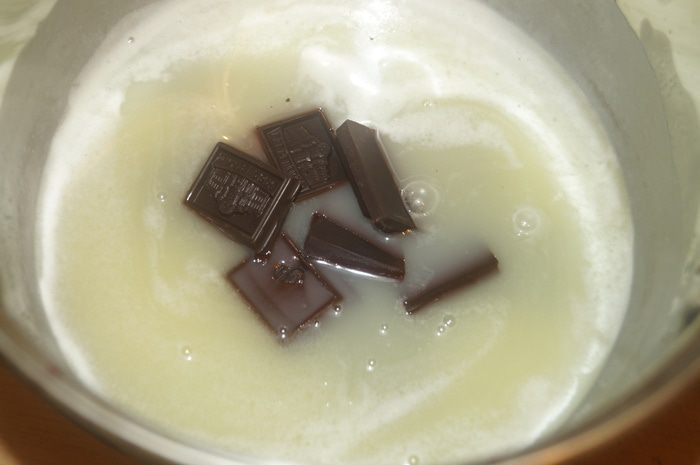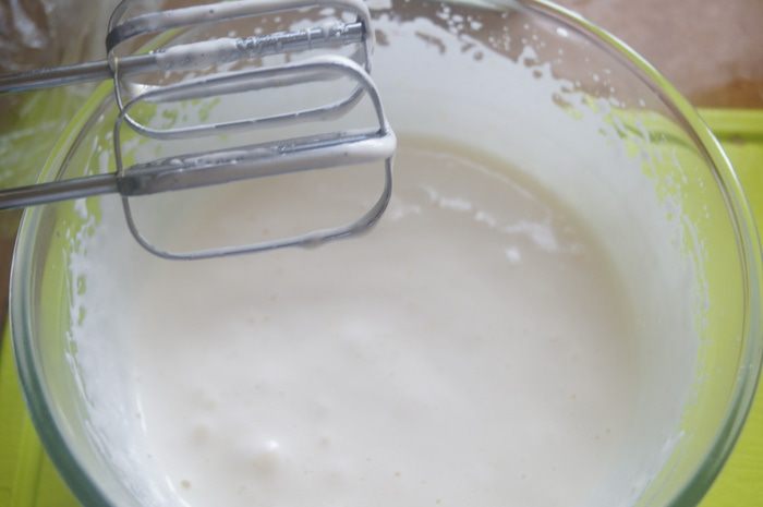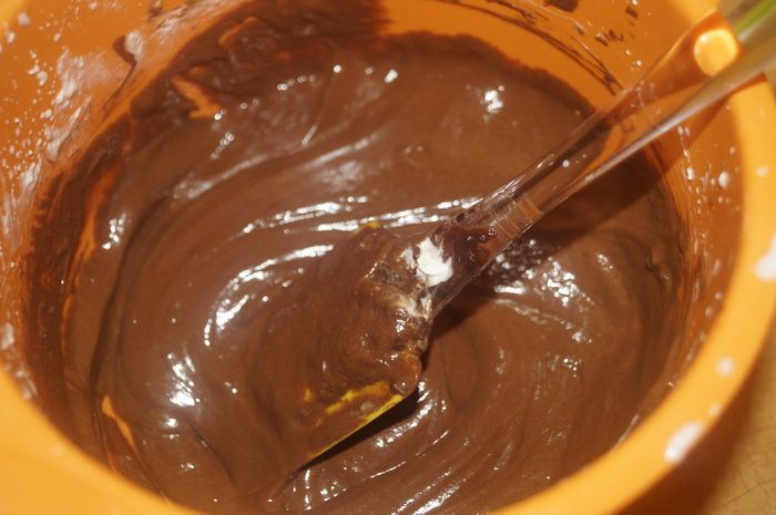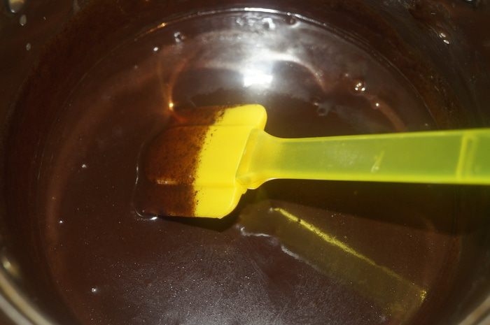 Довести до кипения и ввести разведенный крахмал. Варить помешивая до загустения. Немного остудить и ввести желатин, мешать до полного его растворения. Массу остудить до 30°C.