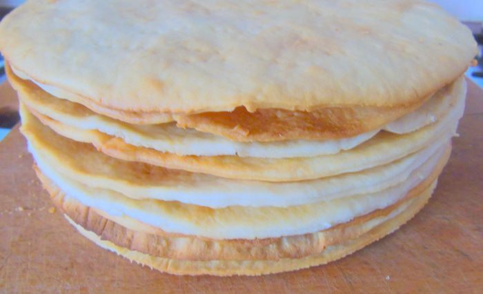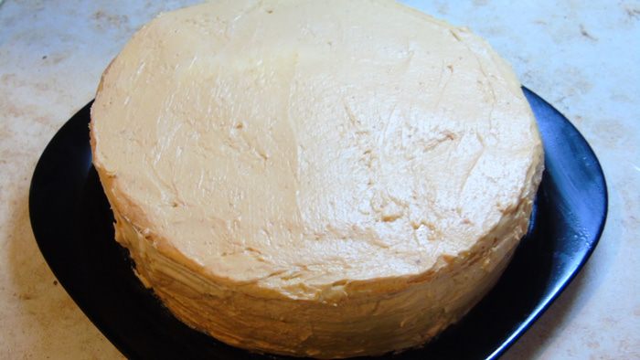 Перемазываем все коржи кремом (2 ст. л. на корж), верх и бока также смазываем.