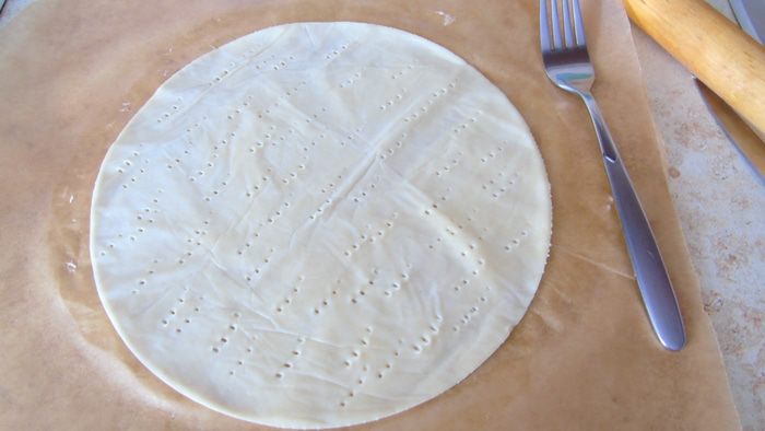 Снимаем верхний лист пергамента и вырезаем круг, накалываем вилкой и выпекаем в разогретой до 220°С духовке 5 минут до золотистого цвета. Так поступаем со всеми коржами. Обрезки тоже выкладываем на противень и выпекаем.
