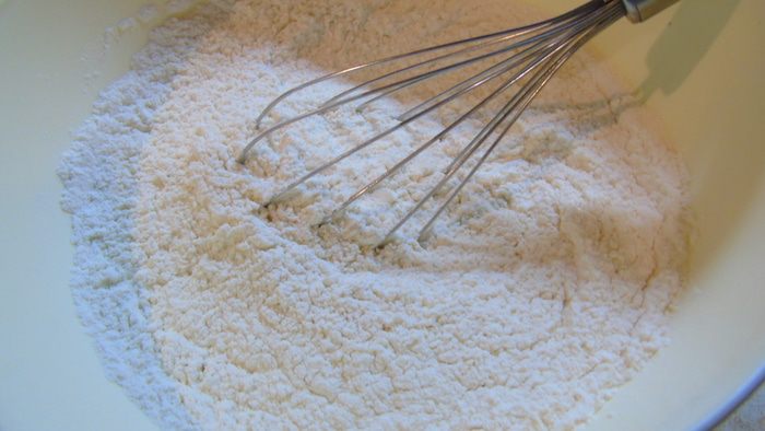 Начнем готовить коржи: муку размешаем с разрыхлителем.