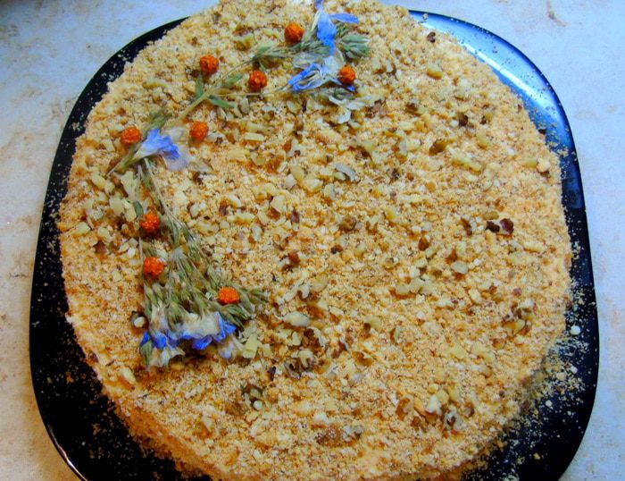 Обрезки от коржей измельчаем и посыпаем торт со всех сторон, украшаем по своему желанию, можно еще измельченными орехами присыпать.